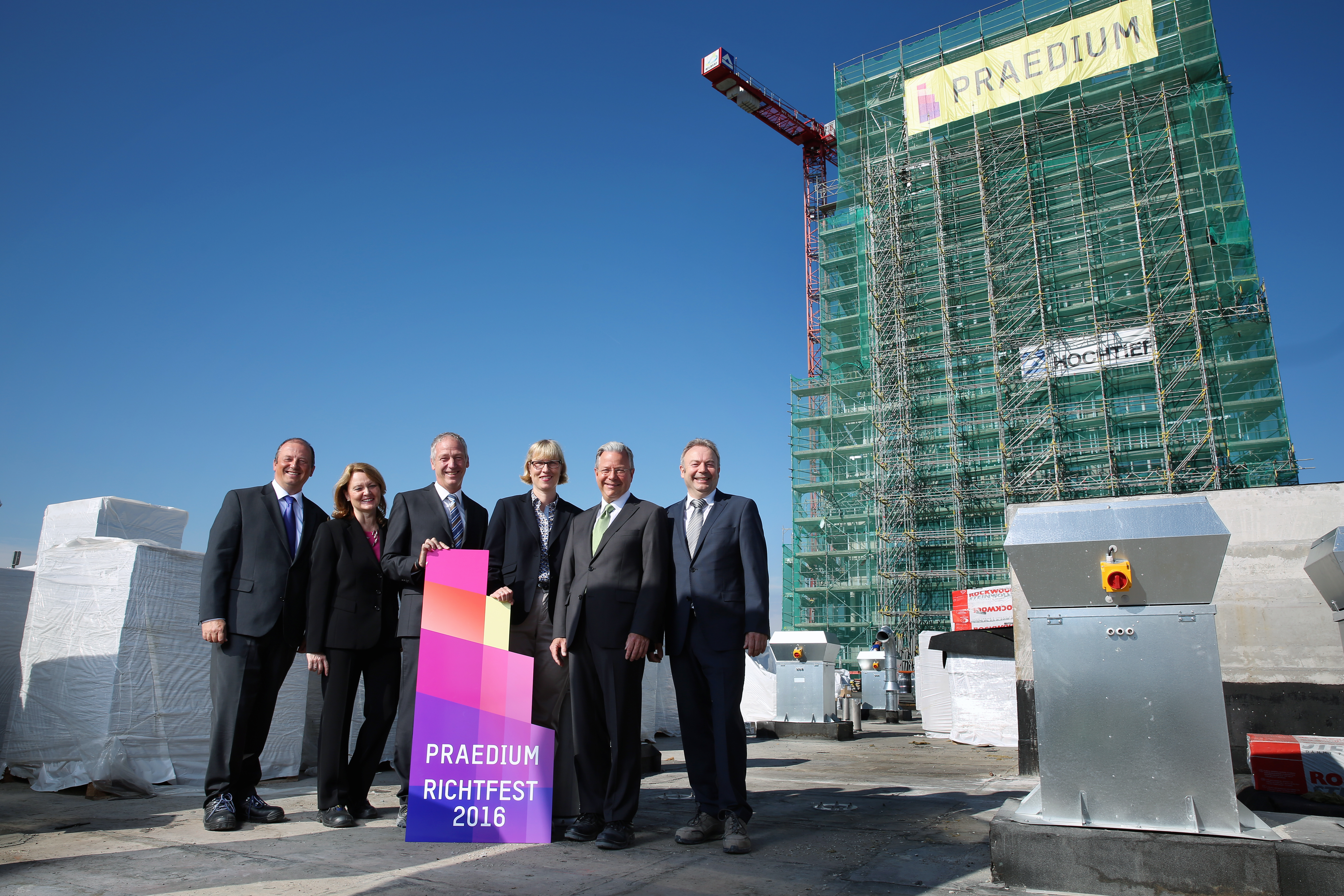 Frankfurt am Main, 18. August 2016. Der Bau des neu entstehenden Wohnhochhauses PRAEDIUM im Frankfurter Europaviertel hat einen wichtigen Meilenstein erzielt: Der Rohbau hat seine volle Höhe von 60 Metern erreicht. Das ist Anlass für den Bauherrn, die Nassauische Heimstätte, vertreten durch die Geschäftsleitung und dem PRAEDIUM-Bauherrenteam, allen an dem Baufortschritt beteiligten Projektpartnern für die reibungslose und planmäßige Realisierung zu danken. „Der Rohbau wurde „just in time“ errichtet“, stellt Dr. Thomas Hain, Leitender Geschäftsführer der Nassauischen Heimstätte fest. „Aufgrund der markanten Architektur unter Federführung der renommierten Architekten Dietz Joppien und der zentralen Lage inmitten des Europaviertels wird das PRAEDIUM ein Highlight des neuen Stadtteil werden“, betonen Dr. Thomas Hain, Dr. Constantin Westphal und Monika Fontaine-Kretschmer. Bereits im nächsten Jahr soll das 19-geschossige Wohnhochhaus mit einer Gesamtwohnfläche von 24344 m² und einer Gewerbefläche von 1613 m² fertiggestellt sein. Dann können die 242 Eigentumswohnungen ebenso wie die acht Shops, die Gastronomie und das Büro planmäßig bezogen werden.