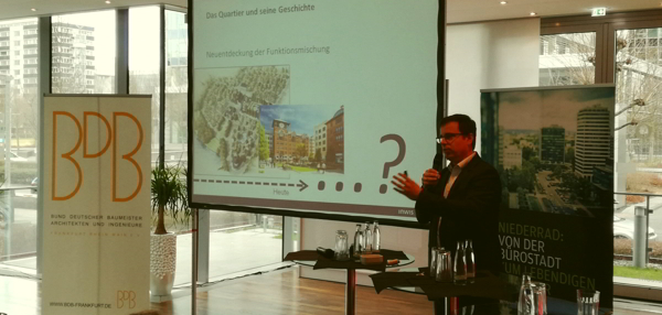 Am Beispiel der Bürostadt Niederrad und zahlreicher Konversionsflächen in Deutschland und Europa machten die Redner klar, dass sowohl reine Büroquartiere als auch reine Wohngebiete nicht mehr zeitgemäß sind. „Die Experimente der radikalen Funktionstrennung sind, zumindest im großen Maßstab, gescheitert“, stellte Torsten Bölting vom InWIS in Bochum fest. Das sieht auch Mike Josef, Planungsdezernent der Stadt Frankfurt so: „Heute schätzen Menschen nicht mehr monofunktionale Viertel, sondern wünschen sich kurze Wege ins Grüne und zu zentralen, lebendigen Plätzen.“ Gerade in Ballungsräumen mit einem hohen Zuwanderungsdruck, so die Experten, böten Büroquartiere daher die Möglichkeit, Wohnraum zu schaffen. Dafür eigneten sich leer stehende Bürogebäude ebenso, wie freie Grundstücke, die nicht als Grünflächen genutzt würden.