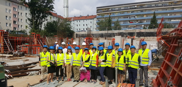 Die Gäste besuchten die derzeit größte ALEA-Baustelle im Rhein-Main-Gebiet, einen 6-geschossigen Wohnungsneubau mit Tiefgarage in Offenbach am Main. Gemeinsam mit dem verantwortlichen Bauleiter Ing. Christof Zimnol und dem Polier Hans Trumpp wurde das Bauvorhaben in Begleitung eines Dolmetschers begangen. Rund 1 Stunde erläuterte Reimann am Beispiel dieser Wohnbaumaßnahme das industrielle Bauen, den Einsatz von Fertigteilen und das Arbeiten mit Spezialbeton. Großes Interesse und viele Fragen gab es zu dem variablen Schalungssystem. Polier Hans Trumpp erläuterte ausführlich den Einsatz von speziellen Einbauteilen, die die Tiefgarage wasserdicht werden lassen. Am Beispiel der Baugrube und der Nähe zum Main führte Ing. Christof Zimnol aus, welche Bedeutung die Wasserhaltung bei einem Projekt haben kann und von welch großer Bedeutung sie beim aktuellen Projekt ist. Beeindruckt waren die Gäste von der Bauzeit der Baumaßnahme, die mit 8 Monaten, auch für chinesische Verhältnisse, als ausgesprochen schnell empfunden wurde.