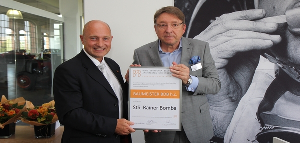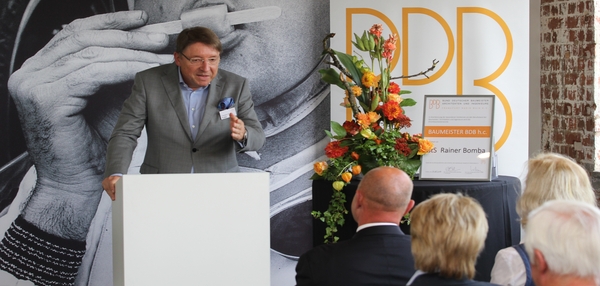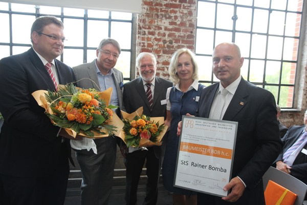 Der Bund Deutscher Baumeister Architekten und Ingenieure Frankfurt Rhein Main e.V. (BDB) hat heute die Ehrenbaumeisterwürde an Rainer Bomba, Staatssekretär im Bundesministerium für Verkehr und Infrastruktur, verliehen. Im Rahmen eines Festaktes nahm Bomba die Ehre an und trägt damit ab sofort den Titel Baumeister BDB h.c.