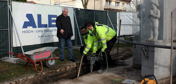 An einem geschichtsträchtigen Ort ist die Firma ALEA Hoch- und Industriebau AG tätig: Maurer legen die 20 Zentimeter dicke Bodenplatte des denkmalgeschützten Hassia-Brunnentempels im Kurpark frei. Die Hassia Quelle war 1936/37 von Wilhelm und Otto Hinkel gemeinsam mit der Stadt Bad Vilbel erbohrt worden. 1955 wurde das Quellvorkommen als Heilquelle staatlich anerkannt. Das Mineralwasser kommt aus einer Tiefe von 120 Metern. Die Bodenplatte ist im Laufe der Jahre wasserdurchlässig geworden, was die darunter liegende „Brunnenstube“ mit der Technik des Brunnens und dem Zugang zum Quellenschacht beeinträchtigt. Die beiden Maurer Zerif Ajvazi und Shaib Ymeri haben die Bodenplatte rings um den Brunnen und etwa 20 cm vom Unterbau freigelegt. „Arbeiten am Denkmal sind Aufgaben, die einen Facharbeiter im Bauhauptgewerbe fordern. Hier ist oftmals Filigranarbeit notwendig, da kommt zum Anwendung, was in der Ausbildung erlernt wurde“, so Reimann. „Weitere Fachfirmen werden dort mit Bitumenschweißbahnen eine neue Isolierschicht auftragen und die „Brunnenstube“ renovieren“, ergänzt der bauleitende Architekt Achim Stelz. „Das Pflaster setzen die ALEA-Mitarbeiter wieder auf, doch das Erdreich darunter muss entsorgt werden, weil es sich nicht ausreichend verdichten lässt. Dafür soll mit Schotter aufgefüllt werden.“