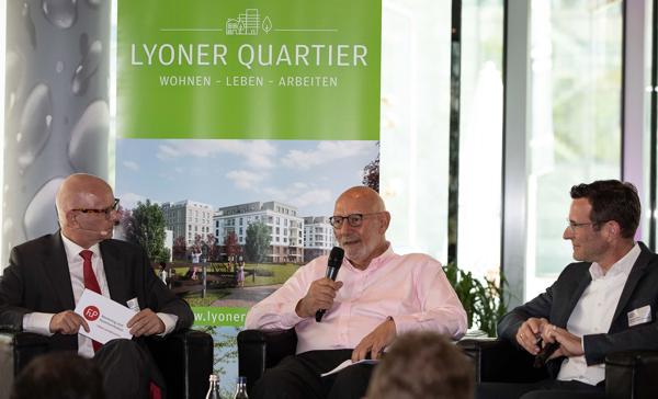 Zum Auftakt der Veranstaltung erzählte Claus Wisser, Gründer der WISAG AG von seinen Erfahrungen mit der Sanierung von Immobilien. „Immobilien sind für mich eine Herzensangelegenheit“, gesteht Wisser, so hat er das Kloster Johannesberg gekauft, um es wiederherzurichten. Das schlechte Image von Niederrad habe er nie verstanden und findet die Entwicklung des Lyoner Quartiers wunderbar. Axel Bienhaus, Geschäftsführender Gesellschafter bei AS+P, stellte einige Revitalisierungsprojekte unter anderem in Shanghai vor. Im Lyoner Quartier entwickelte AS+P das Lyoner Carrée für die ABG Holding, 5 Passivhäuser mit 134 Wohnungen. „Für Städte wie Frankfurt sind B- und C-Lagen wichtig, um bezahlbaren Wohnraum anbieten zu können“, so Bienhaus.