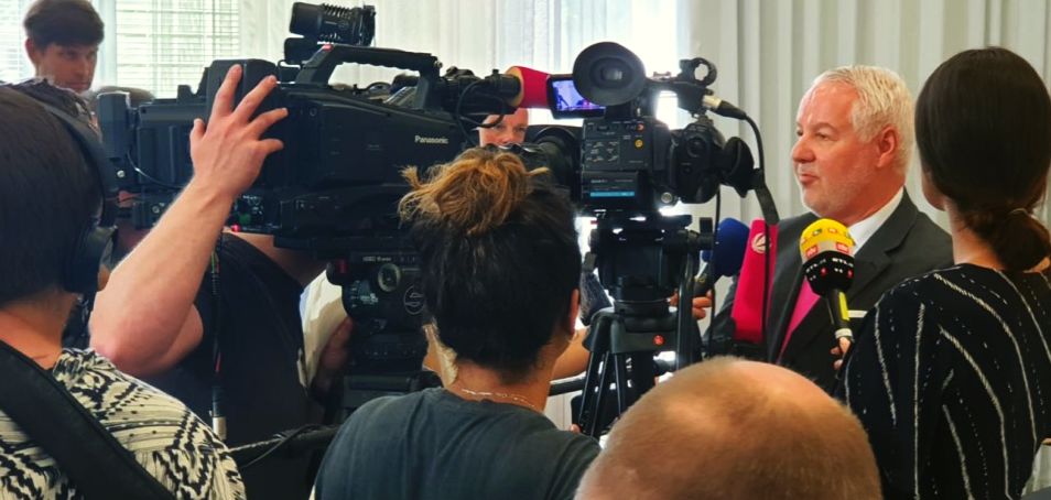 Der Vorstandsvorsitzende des mittelständischen Bauunternehmens ALEA AG, sowie ehrenamtlich engagierter BDB-Vorstand und Vorsitzender des VhU-Bau- und Immobilienausschusses Thomas M. Reimann mit einem Statement zum Klimaschutz in der Landespressekonferenz am 02. Juli 2019 in Wiesbaden: