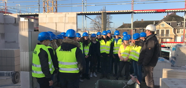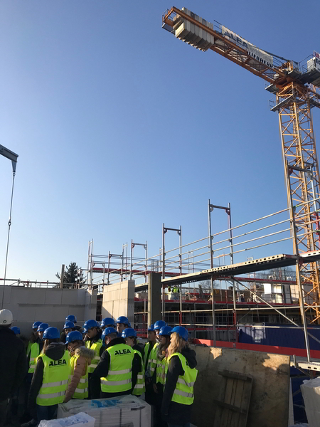 Erneut besuchen Schüler einer 9. Realschulklasse am 10.12.2019, dieses Mal der Kennedy-Schule in Bad Vilbel, mit den Lehrerinnen Frau Betz und Frau Sarow eine Baustelle der Firma ALEA in der Nähe des Nordbahnhofs. Bei herrlichem Sonnenschein werden damit die Aktivitäten der INITIATIVE ZUKUNFT FACHKRAFT mit der Erkundung einer Baustelle für Schüler fortgesetzt. Für die Initiative arbeiten weiterhin der Bund Deutscher Baumeister, BDB-HESSENFRANKFURT, die Baufirma ALEA, das Tiefbauunternehmen HGW, die Vermessungsfirma TPI sowie E+CO O und weitere im Baubereich tätige Unternehmen zusammen. Ziel ist es, junge Menschen über die Bauberufe vor Ort zu informieren und ihnen zugleich bei der Orientierung über ihren künftigen beruflichen Weg zu helfen. Das geschieht mittels der praktischen Anschauung in unterschiedlichen Etappen auf der Baustelle. Der erfahrene Polier Hans Trumpp führt die 20 Schüler durch die unterschiedlichen Stationen, erklärt sachkundig die einzelnen Arbeitsgänge und vergisst auch nicht, auf die wichtigen Sicherheitsaspekte hinzuweisen. Die Schüler selbst merken es an ihrer Kleidung, denn sie müssen eine Sicherheitsweste und einen Helm tragen.