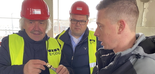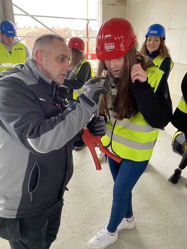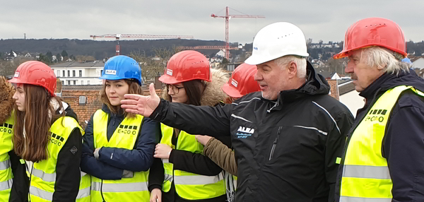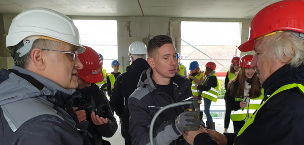 Vor Ort stellte man fest, dass das Projekt weit fortgeschritten ist, die nächsten Gewerke anstehen. Bislang haben sich fast 100 Schüler und Schülerinnen aus Hanau und Bad Vilbel über die Ausbildung als Betonbauer, Maurer, Rohrleitungsbauer, Tiefbauer, Einzelhandels- oder Großhandelskaufmann und die damit verbundenen Chancen und Perspektiven innerhalb der letzten 3 Monate informieren können. Mit Beginn der Ausbauphase im Objekt wird, im Rahmen neuer Gewerke, somit auch über neue Ausbildungsberufe informiert. Das mit dem Ausbau beauftragte Unternehmen E+CO O hat über Ausbildungsmöglichkeiten im Bereich der Dachdecker, sowie des Gewerks Heizung + Sanitär informiert. Fa. Lauer Industrieservice bildet Mitarbeiter für die verschiedensten Bereiche der technischen Gebäudeausrüstung selbst aus.