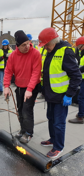 Die Firma GVW Geräte Verleih Wetterau hat, trotz drohendem Schneefalls, junge Menschen mit einer Hebebühne in luftige Höhen mitgenommen. So konnte man sich weit über dem Boden einen Überblick von der Baumaßnahme verschaffen. Ehrengast „Stepi“ , sowie Schülerinnen der Klasse 9aR, legten bei den Dachdeckern selbst Hand an und verlegten Schweißbahnen. „Unser Vorstandskollege Reimann schreibt hier eine Story für junge Menschen, die einen Weg in die Ausbildung suchen“, sagt der 1. Vorsitzende des BDB-HESSENFRANKFURT Andreas Ostermann. „Wir sind hier mit den Schülern in der Baugrube gestartet, haben das Gebäude mit den jungen Menschen wachsen lassen und zeigen jetzt, wie der Ausbau stattfindet. So können die Teilnehmer sich ein perfektes Bild über die verschiedenen Berufe und die damit verbundenen Chancen und Perspektiven verschaffen.“