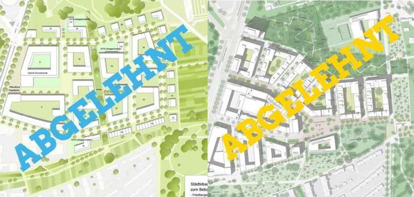 Dabei scheint man doch alles richtig gemacht zu haben, nachdem der städtebauliche Entwurf zum Magistratsbeschluß 2016 (oben links) politisch keine Akzeptanz fand und in seiner ursprünglichen Form abgelehnt wurde. Als 2017 die Stadtverordnetenversammlung die Aufstellung zum Bebauungsplanverfahren beschloss, war dies mit vielen Anforderungen zu Planung, Verkehr, Klima und Ökologie verbunden. Ein städtebaulich-landschaftsplanerischer Wettbewerb mit Bürgerbeteiligung wurde ausgelobt – die Bürgerdialoge fanden im Stadtplanungsamt statt. Ergebnis dessen war das städtebauliche Konzept ‘Die Günthersburghöfe‘ (oben rechts).
