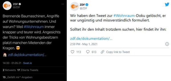 Mit einem Tweet hat das ZDF Gewalteskalationen am 1.Mai relativiert und brennende Baumaschinen und Angriffe auf Wohnungsunternehmen als Reaktion von Mietern auf knappen und teuren Wohnraum dargestellt. Für den BDB-HESSENFRANKFURT ist diese verkürzte Darstellung brandgefährlich.
