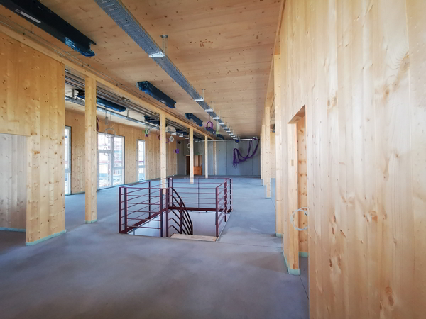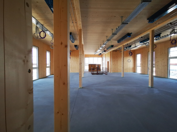 Die Massivholzbauweise hat hier exzellent bewiesen, zu was sie alles fähig ist. Mit nur 120 mm starken Außenwänden und einer 120 mm starken mineralischen Dämmschicht konnte dennoch eine lichte Raumhöhe von ca. 4,00 m erzielt werden. Schlanke Stützen im Innenbereich (180 mm x 180 mm) mit einem Unterzug 180 x 240 mm lassen sich in die Innenarchitektur der Bürozonen sehr gut integrieren. Mit einer Deckenstärke von 140 mm findet der Flachbau einen filigranen Abschluss.