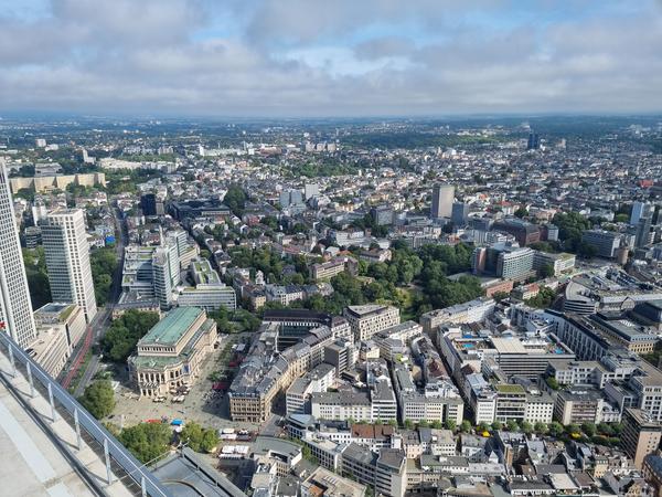 Der Blick auf die am Vortag besuchte Altstadt und das südliche Mainufer ist vom Maintower leider nicht mehr möglich seit der Baumaßnahme ‚Four Frankfurt‘ (ein in unmittelbarer Nähe des Maintower gebauter Hochhauskomplex aus vier Türmen, von denen einer bis auf 233 Meter in den Himmel schießt und die Besucherplattform des Maintower weit überragt).
