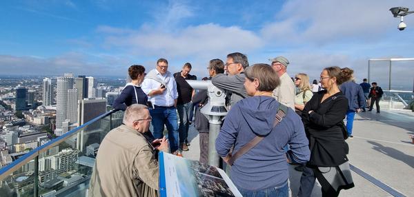 Wenn Engel reisen…. – nach Tagen voll Regen und kalten Wetters war es ein wunderbar sonniger Samstag, in den die Kolleginnen und Kollegen des BDB-Leipzig mit einem Stadtrundblick vom Maintower starten konnten. Dipl.-Ing. (FH) BDB Andreas Ostermann, 1. Vorsitzender des BDB-HESSENFRANKFURT, begrüßte in Begleitung von Brigitte de Jager, Geschäftsstelle BDB-HESSENFRANKFURT, den Kollegen Dipl.-Ing. Architekt BDB Adalbert Haberbeck, 1. Vorsitzender des BDB-Leipzig, und seine fast zwanzigköpfige Gruppe im Foyer des Maintower im Frankfurter Bankenviertel.