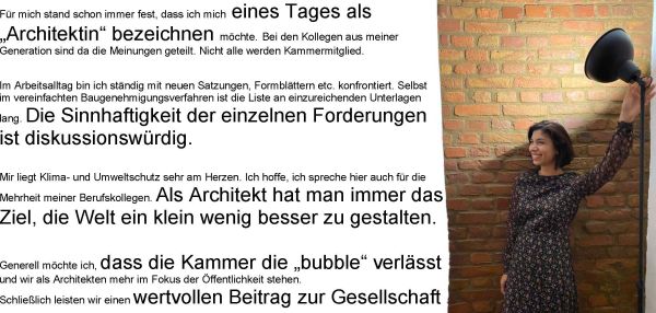 Ich bin seit 2016 berufstätig und seit 2019 Mitglied der Architektenkammer Hessen. Für mich stand schon immer fest, dass ich mich eines Tages als „Architektin“ bezeichnen möchte. Bei den Kollegen aus meiner Generation sind da die Meinungen geteilt. Nicht alle werden Kammermitglied. Und diejenigen, die beitreten, mach dies vor allem wegen des Versorgungswerks. Es heißt dann meistens: „Wenn ich mich nicht selbstständig mache, dann muss ich ja nicht in die Kammer.“